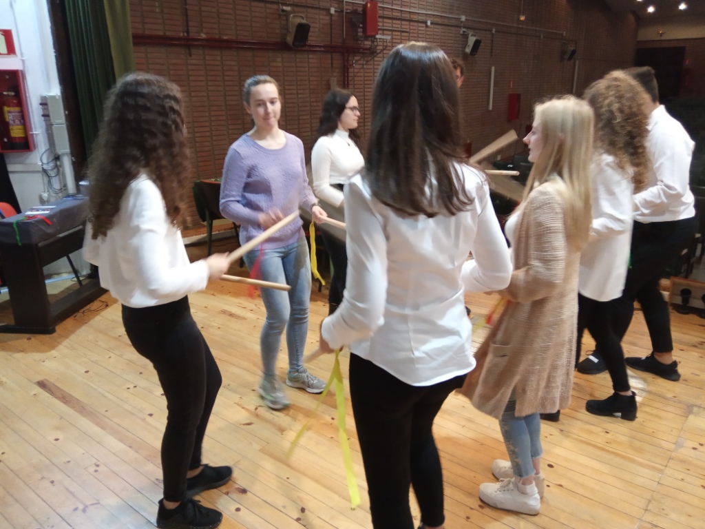 En este caso ha sido con alumnos del Billerica Memorial High School de EEUU, que no es la primera vez que los tenemos en el Centro, así que como bienvenida como solemos hacer otras veces y con la inestimable colaboración de nuestros alumnos de 2º de Bachillerato, se procedió a realizar para ellos una serie de lazos de la Danza de Paloteo de Tábara: